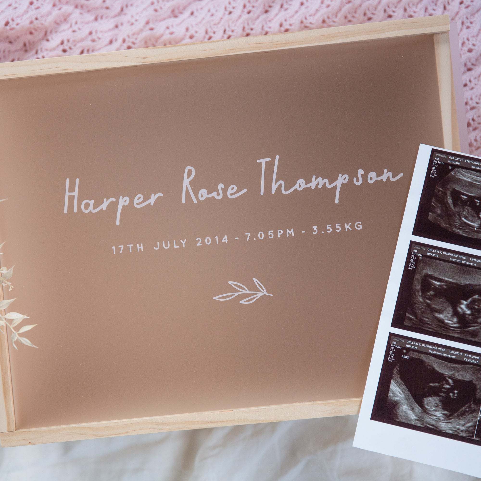 Crafted from natural pine and finished with a frosted acrylic sliding lid, each box is custom engraved with your choice of personalisation, making it a timeless piece to display or tuck away on a shelf. Each box can have a max of two lines of of personalisation, including full name, date of birth and any other additional details you'd like to include.