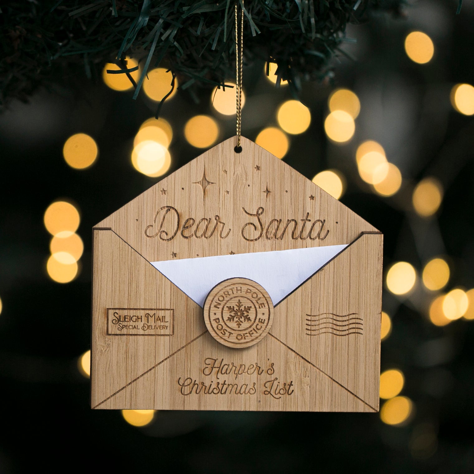 A personalized letter to Santa Claus Christmas ornament with a slot for a letter, decorated with holiday lights and festive design.