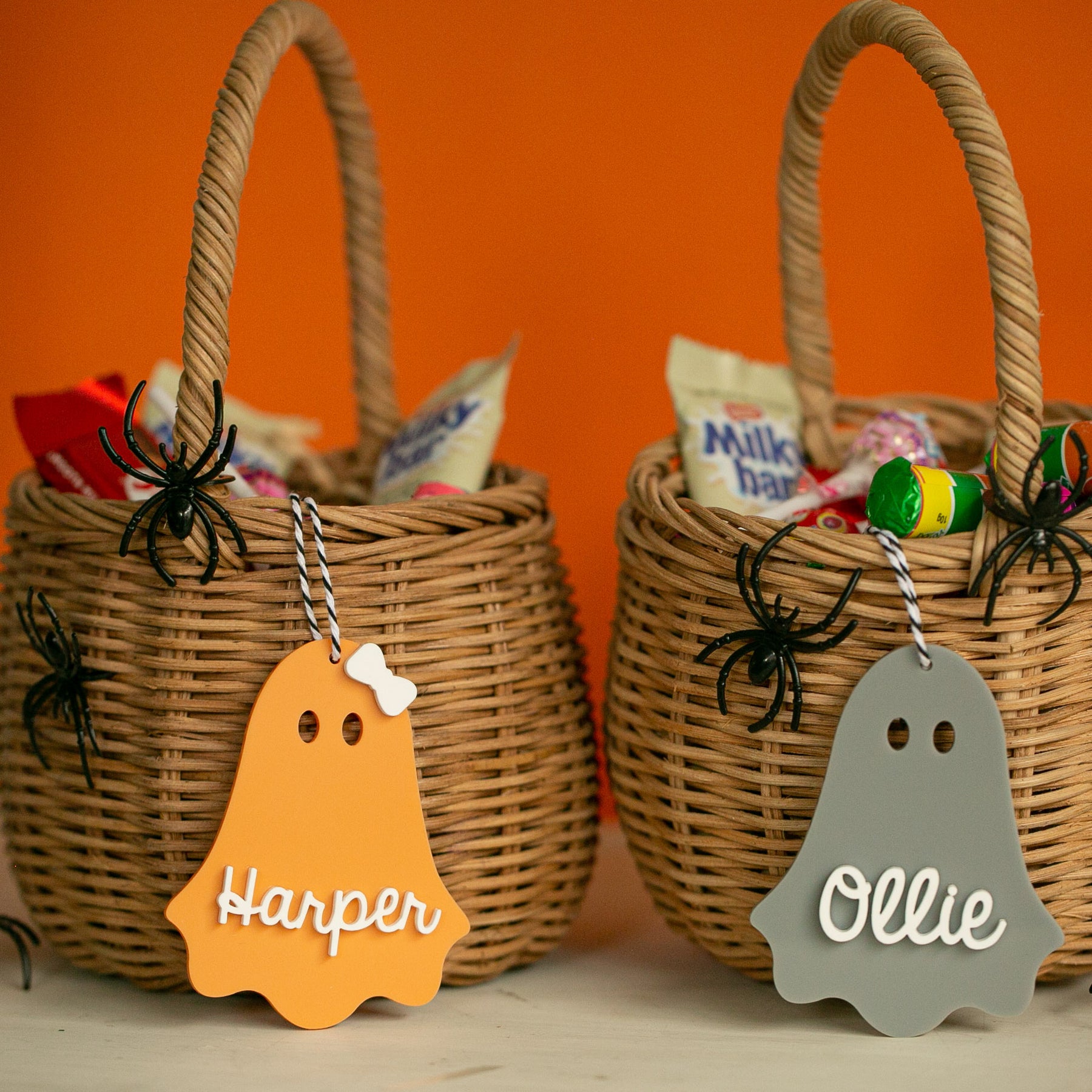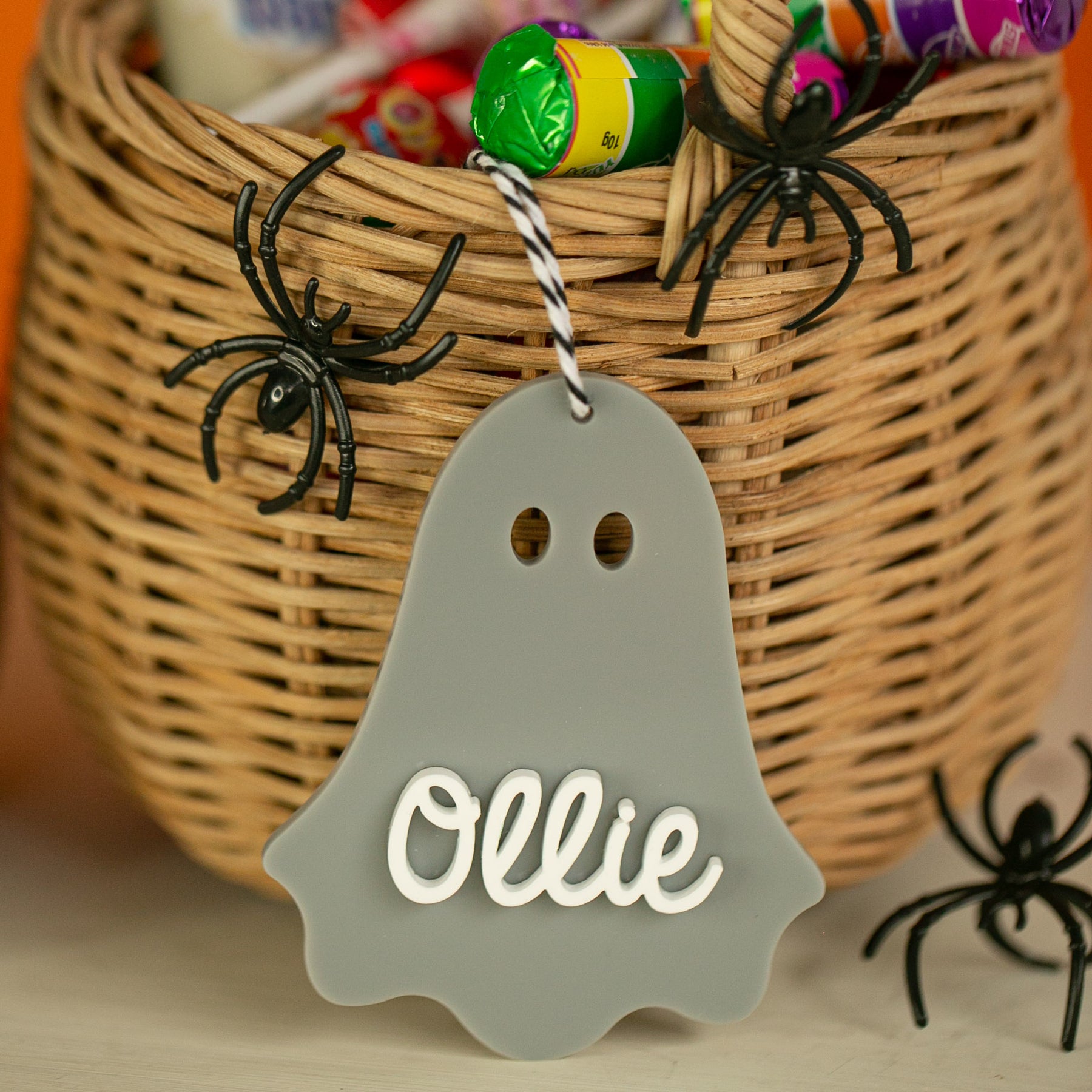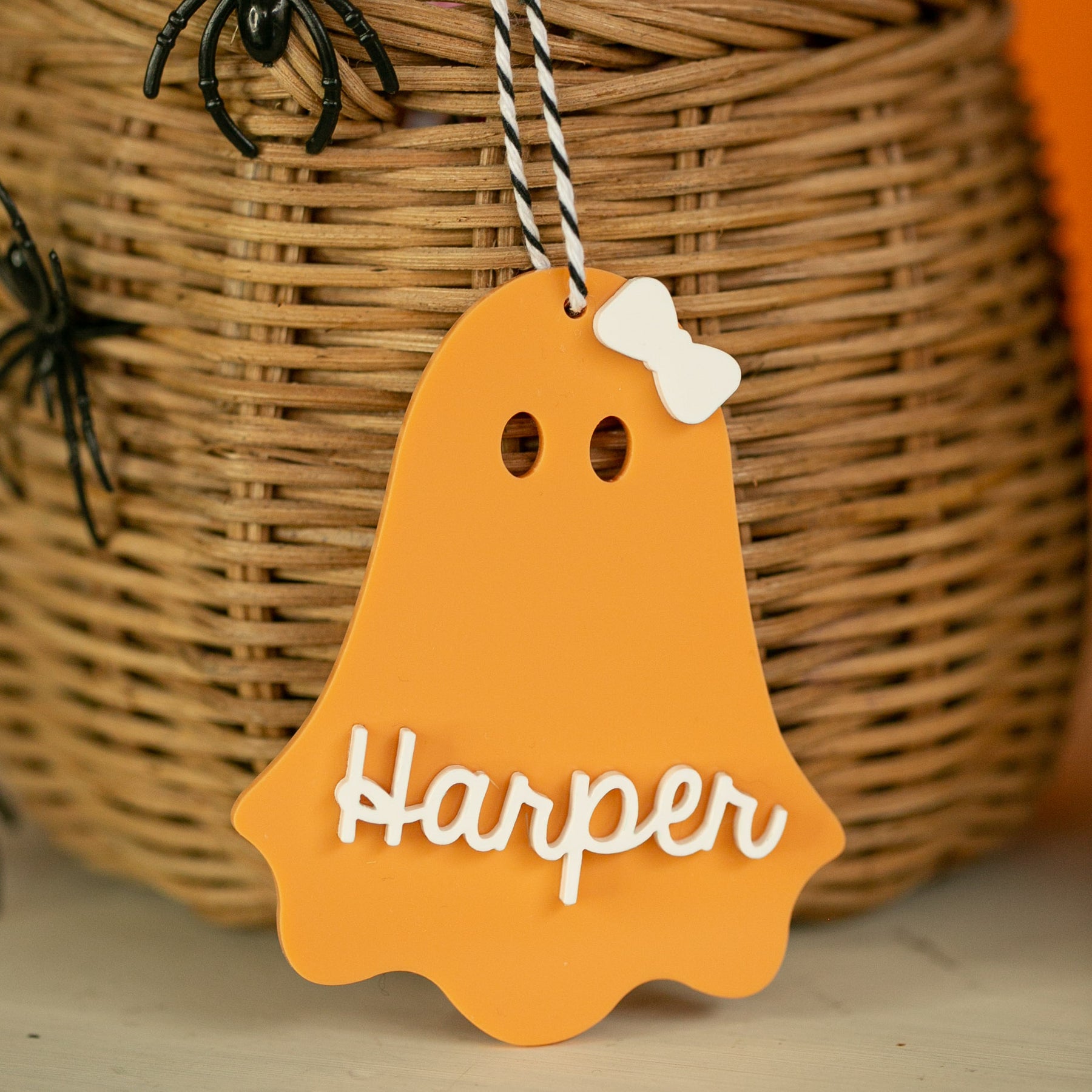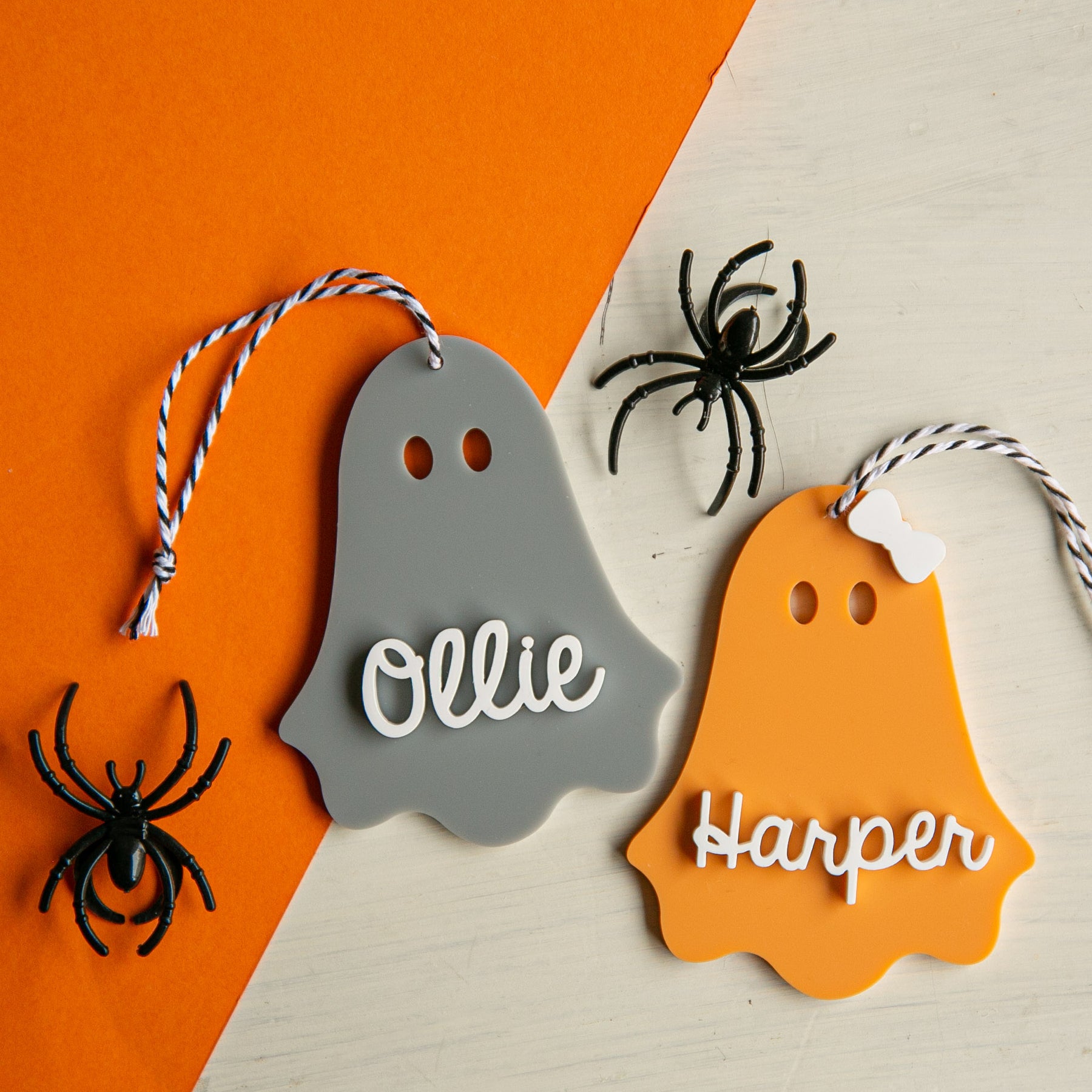These sweet little tags are all about fun (not fright!) and feature the cutest ghost design you’ve ever seen. Crafted in your choice of coloured acrylic, each tag is layered with a gloss white acrylic name in a fun script font.