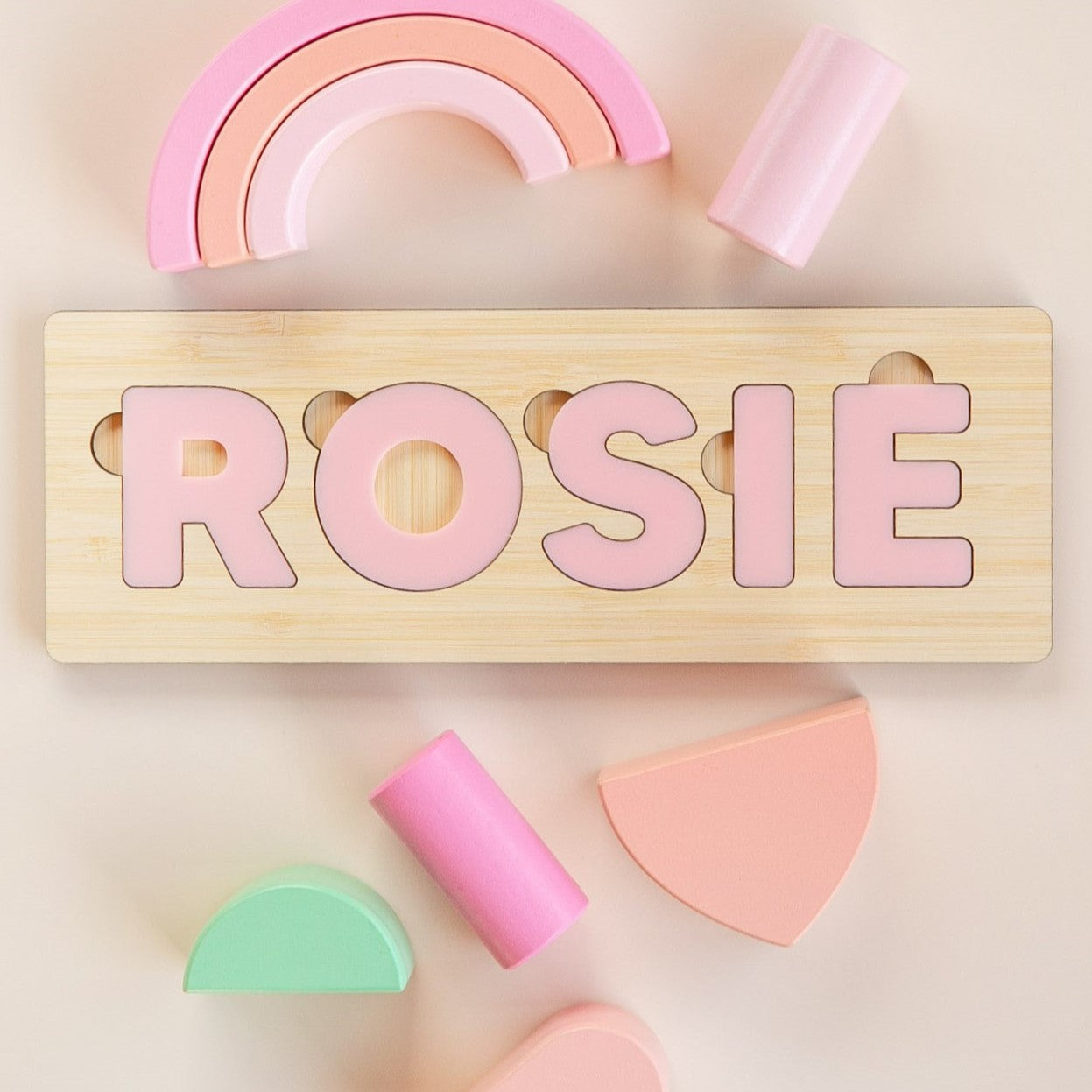 Help them learn their name through play with our Personalised Name Puzzles, a beautifully made hands-on keepsake handcrafted right here in New Zealand. Each puzzle base is built from sturdy MDF topped with our signature 3mm eco-friendly plantation bamboo in your choice of two natural shades, with bold easy-to-hold letters cut from our stunning range of coloured and glittered acrylics.