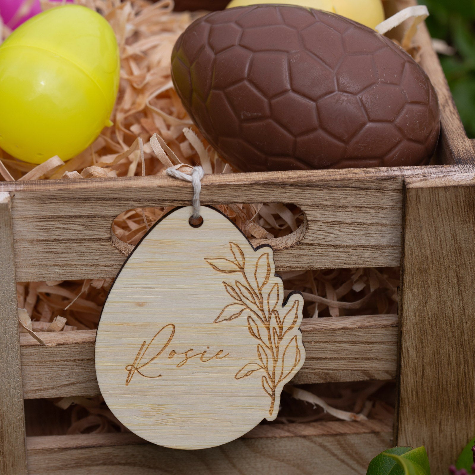 Our tags look beautiful tied to a basket, crate or gift box filled with treats. Sorry – no accessories pictured are included; you're purchasing the engraved Easter tag only.
